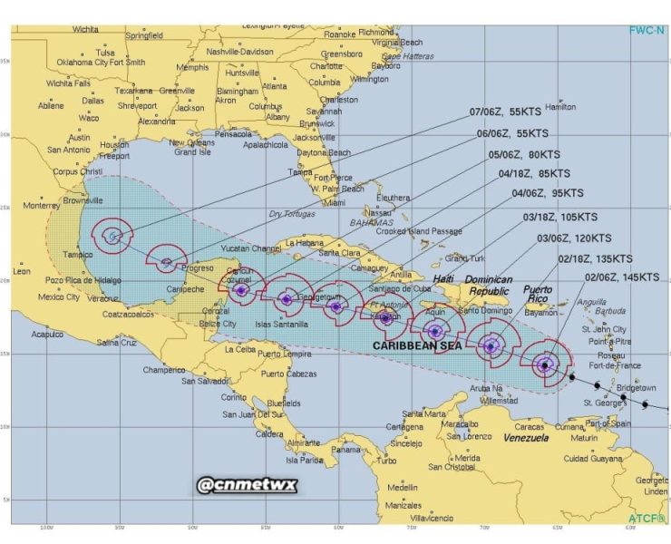 El huracán Beryl, actualmente un poderoso ciclón de categoría 5, continúa su trayectoria a través…