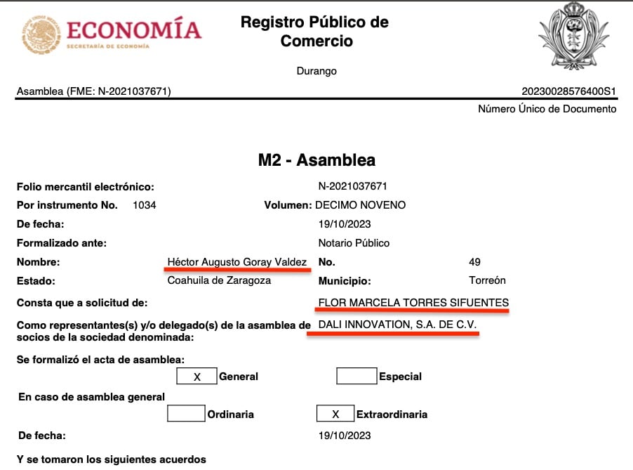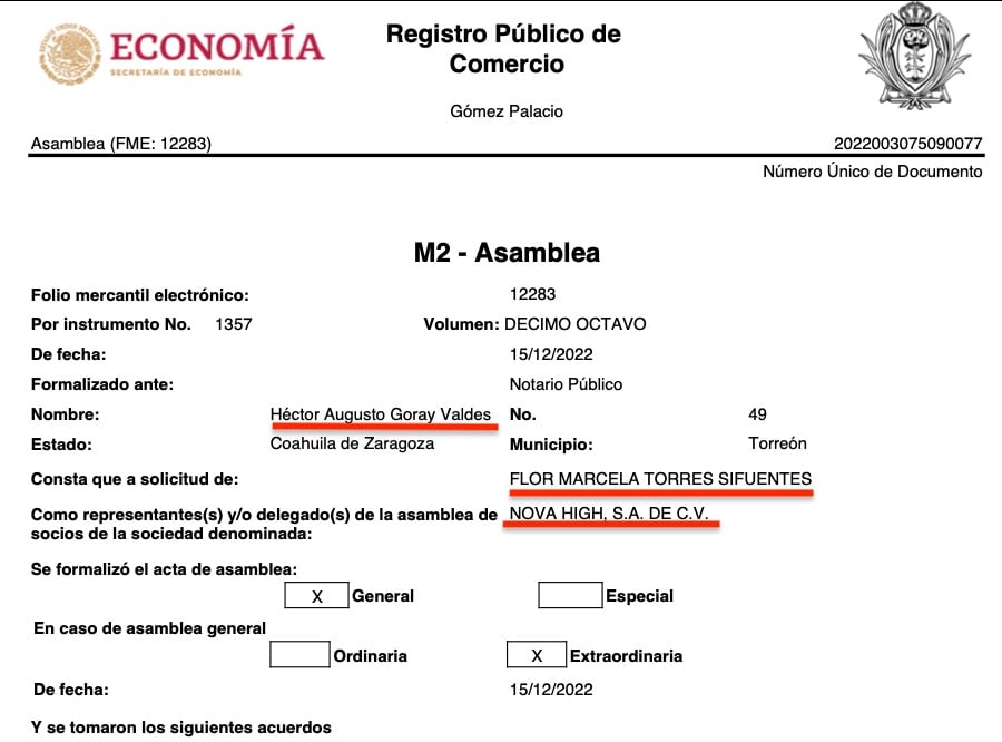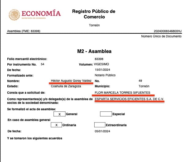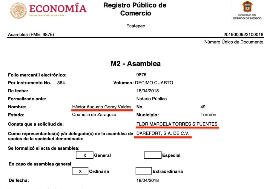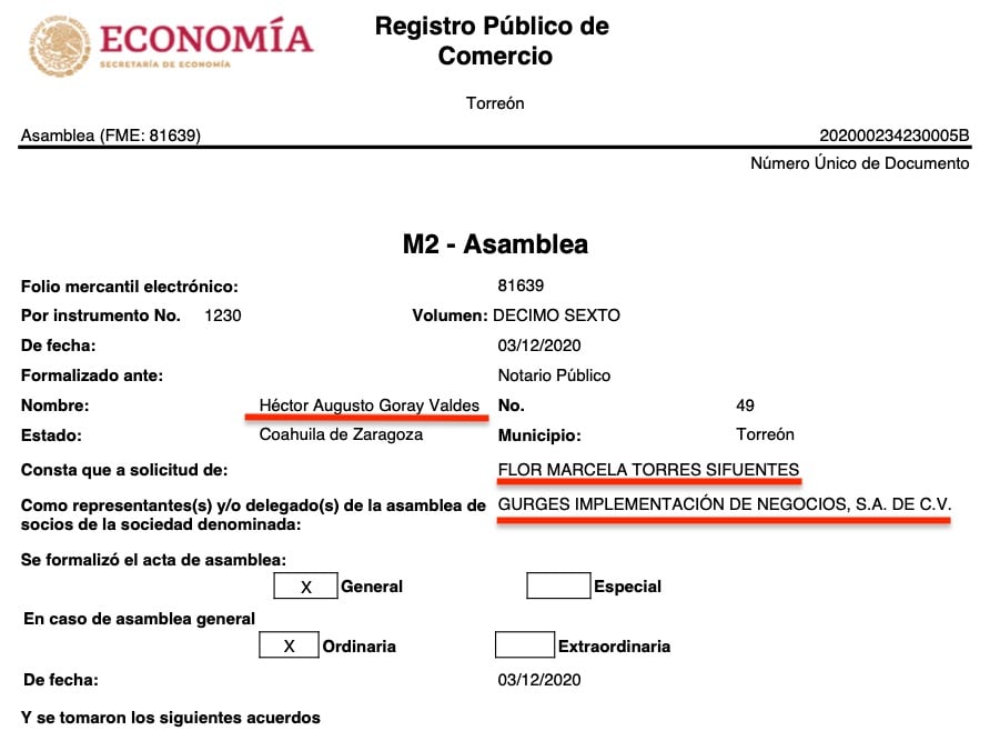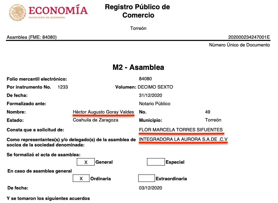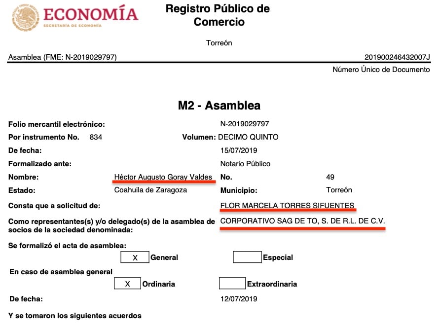 Lo curiosos es que las 16 razones sociales tienen a representantes o apoderados legales en común, todas consignadas ante la fe del Notario Público No. 49, Héctor Augusto Goray Valdés, de Torreón, Coahuila, e igualmente todas a solicitud de Flor Marcela Torres Sifuentes, según consta en los registros públicos de comercio de las citadas empresas, que se ubican en diversas partes del país como Torreón, Coahuila, Durango, Estado de México y Jalisco.
