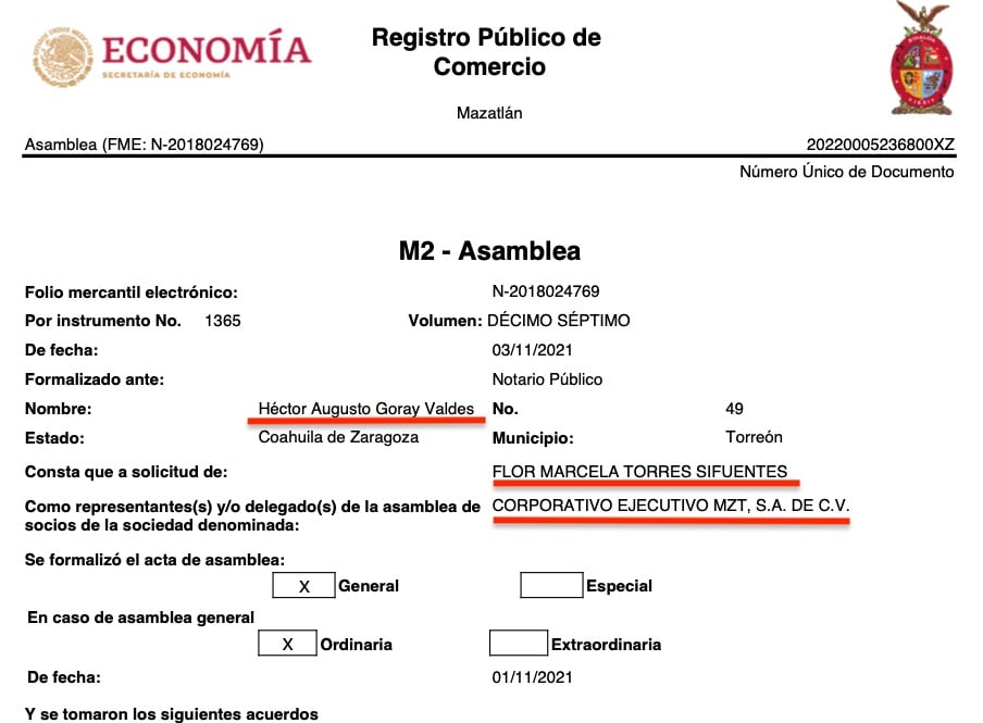 En noviembre de 2017 había nacido en Mazatlán la firma Corporativo MZT, fundada por Martha Beatriz Arredondo Benítez y Nora Lina Rendón Benítez, orientada al ramo contable. Para 2021 ya fungía como delegada especial de la sociedad Flor Marcela Torres Sifuentes, y en menos de tres años cambió cinco veces de objeto social, de acuerdo con los datos registrales, para sintonizarlo con la orientación del Grupo Intermex.