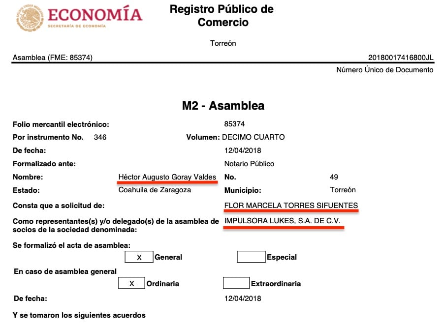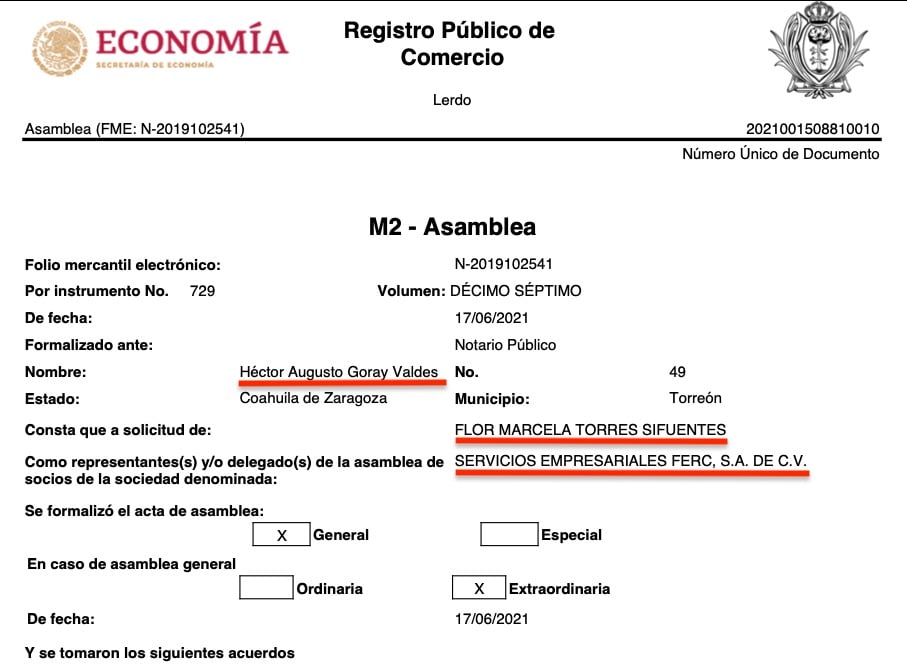 Lo curiosos es que las 16 razones sociales tienen a representantes o apoderados legales en común, todas consignadas ante la fe del Notario Público No. 49, Héctor Augusto Goray Valdés, de Torreón, Coahuila, e igualmente todas a solicitud de Flor Marcela Torres Sifuentes, según consta en los registros públicos de comercio de las citadas empresas, que se ubican en diversas partes del país como Torreón, Coahuila, Durango, Estado de México y Jalisco.