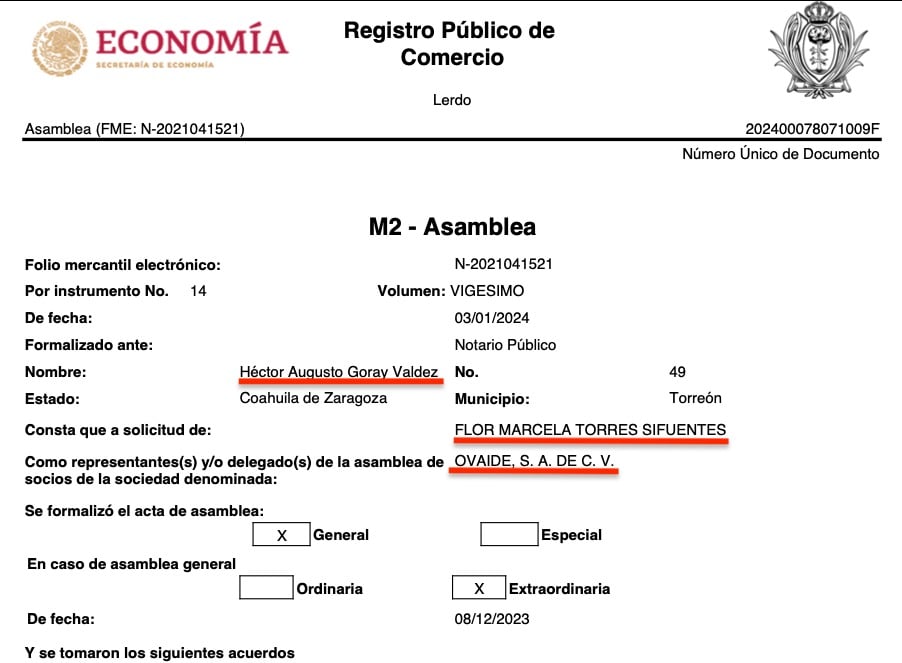 Está además Ovaide, fundada en Lerdo en 2013 por Felipe Méndez López, accionista, a su vez, de Global Intermex, y Victoria Hernández Martínez; a la que se integraron en 2021, como apoderados, Ana Karen Fierro Medina, Javier González Ruiz, y José de Jesús Orozco Escalera; además de Flor Marcela Torres Cifuentes, delegada especial de la sociedad.