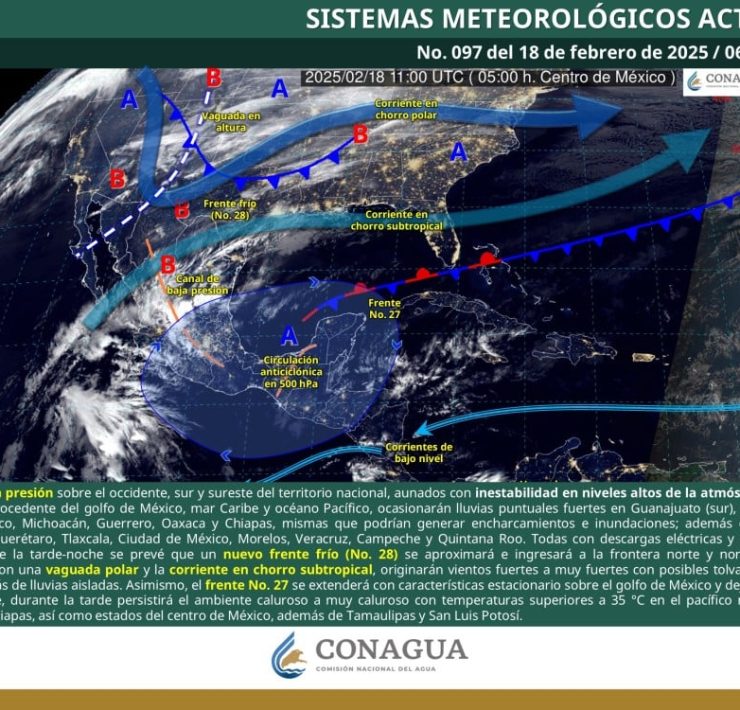 Intervalos de chubascos (5 a 25 mm): Coahuila, Nuevo León, Zacatecas, Aguascalientes, Tamaulipas, Guanajuato, Querétaro, Tlaxcala, Ciudad de México, Campeche, Yucatán y Quintana Roo.