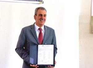 En las oficinas del INE, recibe José Chedraui su constancia de alcalde electo para Puebla.