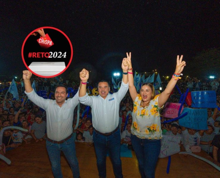 Los candidatos del Partido Acción Nacional, Cecilia Patrón, Renán Barrera y Mauricio Vila, celebran unidos…